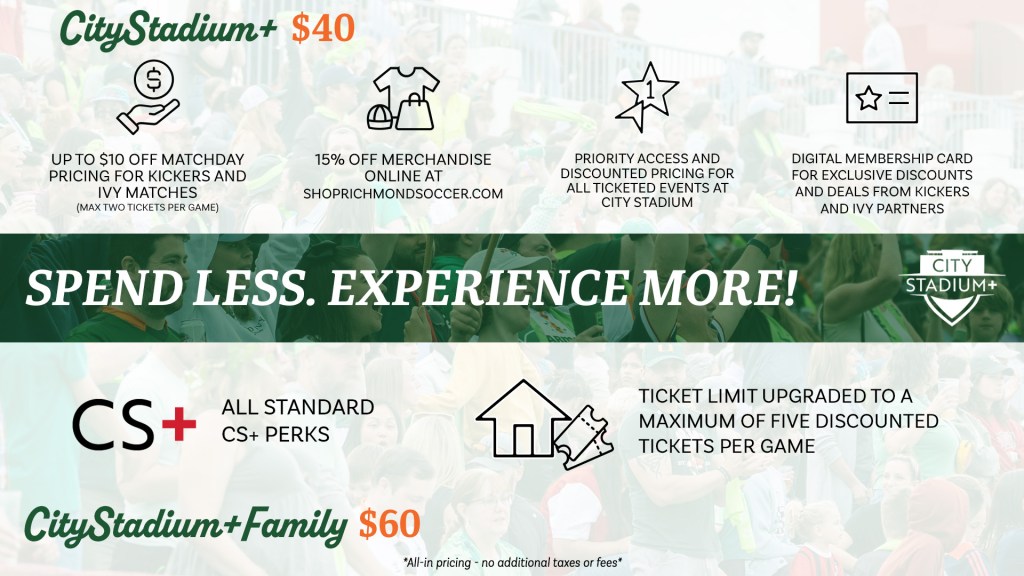 2026 CityStadium+ Memberships are now available! Join now and start using your perks now! Ticket discounts and merchandise savings can be applied for the remainder of the Kickers’ 2025 season and all of the 2026 Ivy and Kickers seasons, so get yours today!